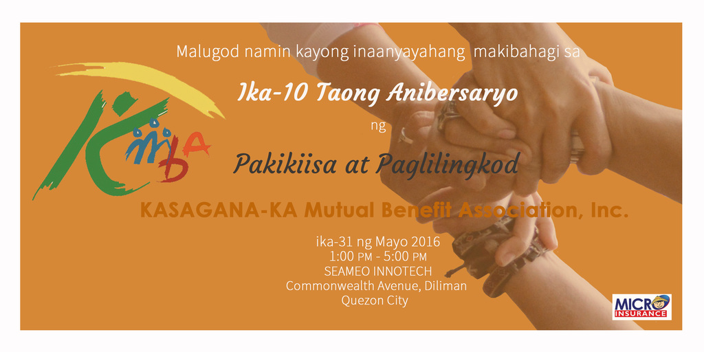 KASAGANA-KA Mutual Benefit Association, Inc. will be celebrating its 10th year Anniversary at SEAMEO Innotech this coming 31 of May 2016