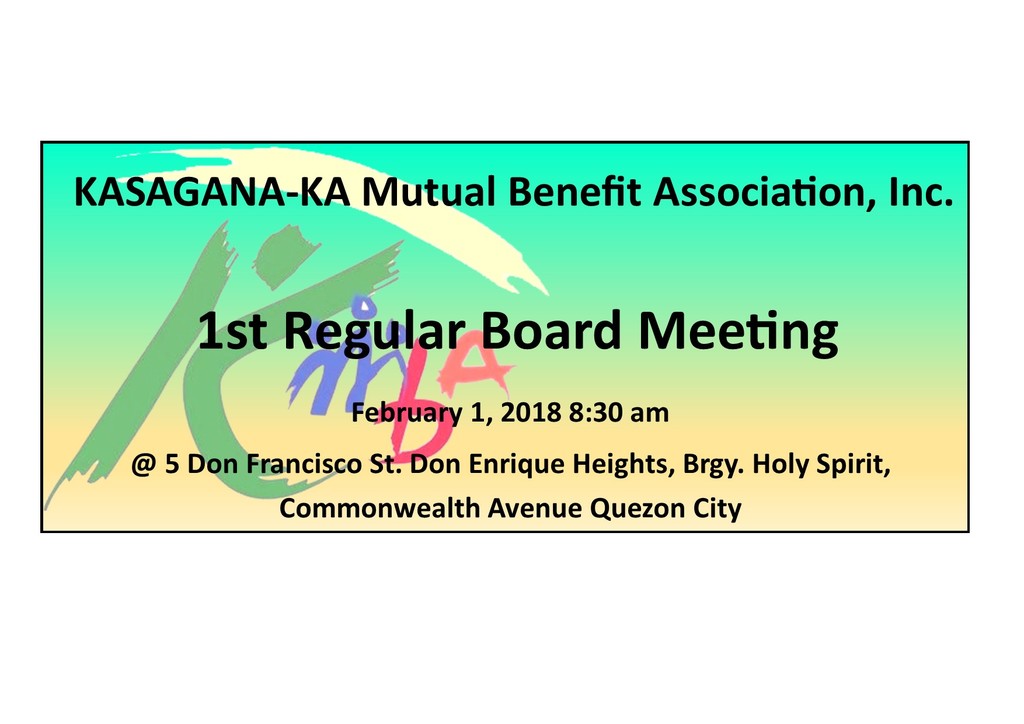 KASAGANA-KA MBA is inviting you to attend the 1st Regular Board Meeting on February 1, 2018 to discuss the following matters.