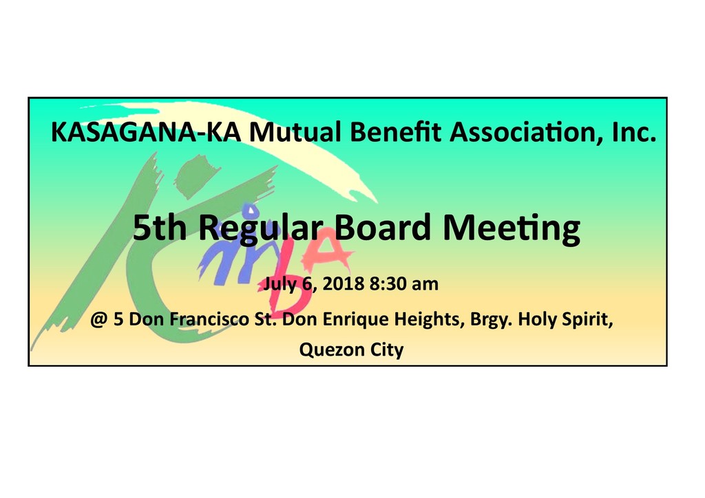 Please be informed that KMBA will be having its 5th Regular Board Meeting on July 6, 2018 at KDCI Office, 8:30 in the morning to discuss the following matters.