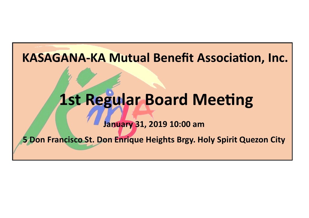 Please be informed that KMBA will have its first Regular Board Meeting of the Board of Trustees for 2019 of January 31, 8.30 in the morning at 5 Don Francisco St. Don Enrique Heights Bry. Holy Spirit Quezon City to discuss the following matters.