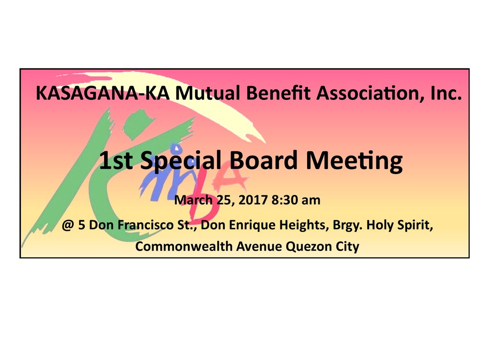 Please be informed that KMBA will have its Special Meeting on March 25, 2017, 8: 30 am at DEHHA Clubhouse, Don Enrique Heights, Holy Spirit Quezon City to discuss the following matters.