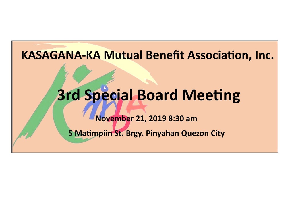 We are inviting you to attend our 3rd Special Board Meeting on November 21, 2019 at KMBA Members' Resource Center, 5 Matimpiin Street Brgy. Pinyahan Quezon City to discuss and approve the following agenda.
