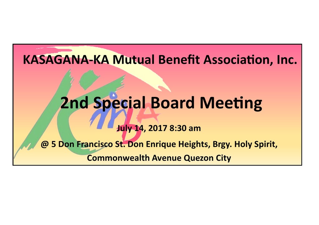 Please be informed that KMBA will have its 2nd Special Board Meeting on July 14, 2017, 8: 30 am at KDCI Head office, 5 Don Francisco St., Don Enrique Heights, Brgy. Holy Spirit Quezon City to discuss the following matters.