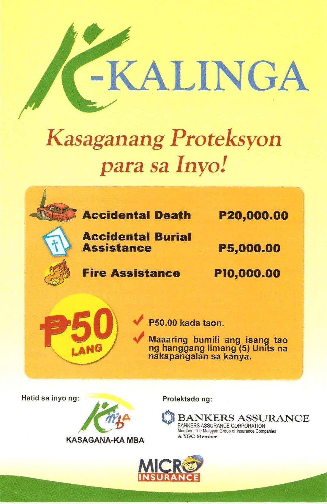 K-Kalinga was designed by KMBA and the Bankers Assurance Corporation so that personal accident insurance with fire protection can be offered as optional product to all KMBA members and their legal dependents and who may be in need of insurance coverage. Individuals 18 to 65 years old may avail themselves of this insurance product